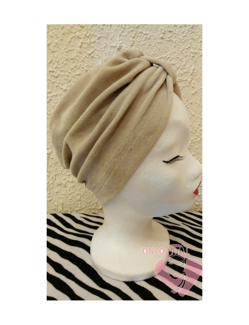 TURBANTE CANCER TERCIOELO BEIG Un básico imprescindible por su comodidad y sencillez. Incluye travilla en el frontal para aportar volumen.en un suave terciopelo beig.